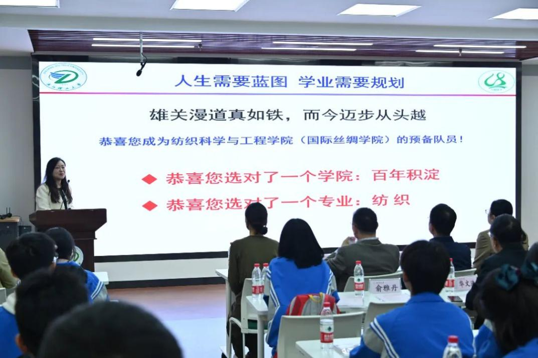 苏淼副院长向在座同学做了学业指导。她深入浅出地介绍了纺织专业的高科技发展和贴近民生的行业领域,既是国之重器也是民之所依。同时列举了纺织学科专业建设、人才培养、国际交流等工作取得的优秀成绩。寄语在座各位同学“有志者事竟成”。