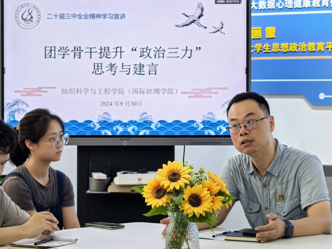 为进一步推进全会精神理论学习走深走实,引领团学青年深入学习领会全会精神,激发青年投身团学工作的热情,同时引导团学干部养成读书习惯,提升团学干部队伍素养,走好人生之路,9月30日,纺织(丝绸)学院在辅导员之家2N-329举行第十三期“红丝享”读书会,聚焦党的二十届三中全会精神精要研读,思考与建言团学骨干“政治三力”的提升,学院党委副书记方平和学院团学骨干参加活动。