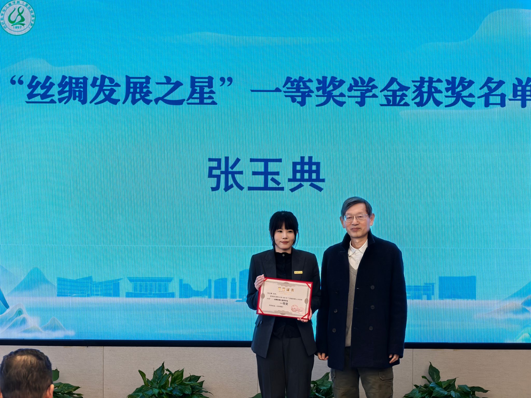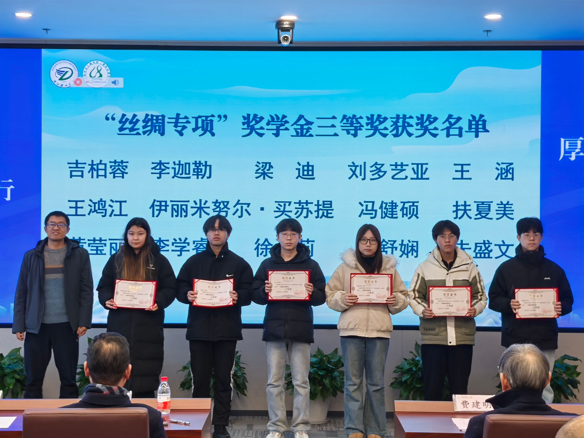 在热烈的掌声中,“美丽丝绸”奖学金颁奖仪式正式举行。本届奖学金设“丝绸发展之星”和“丝绸专项”两个类别,共有38名优秀本硕博学生获奖。