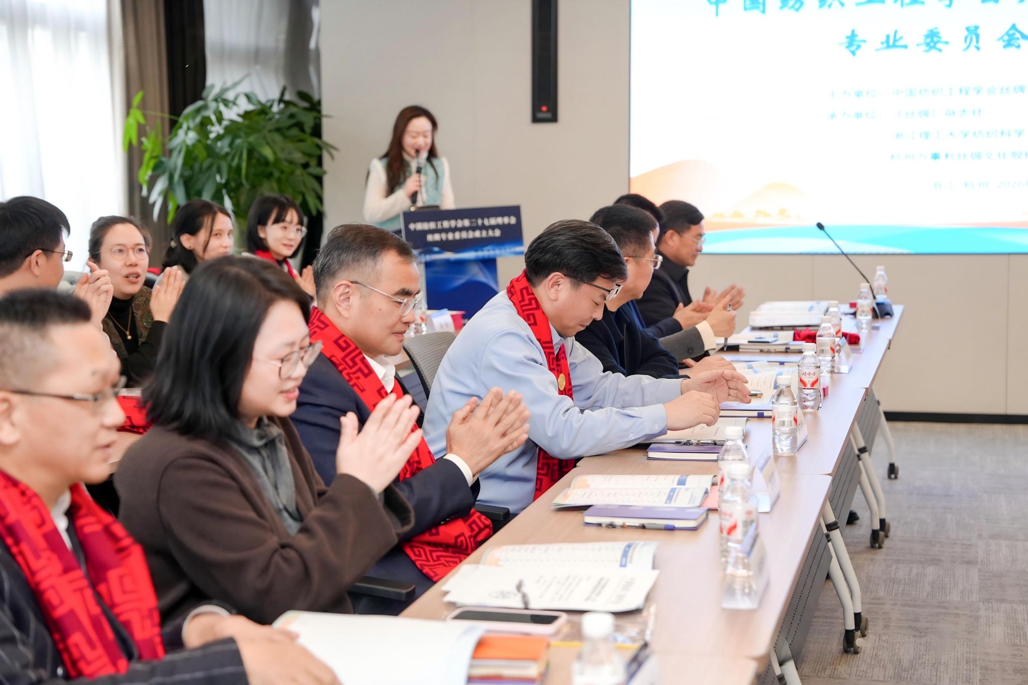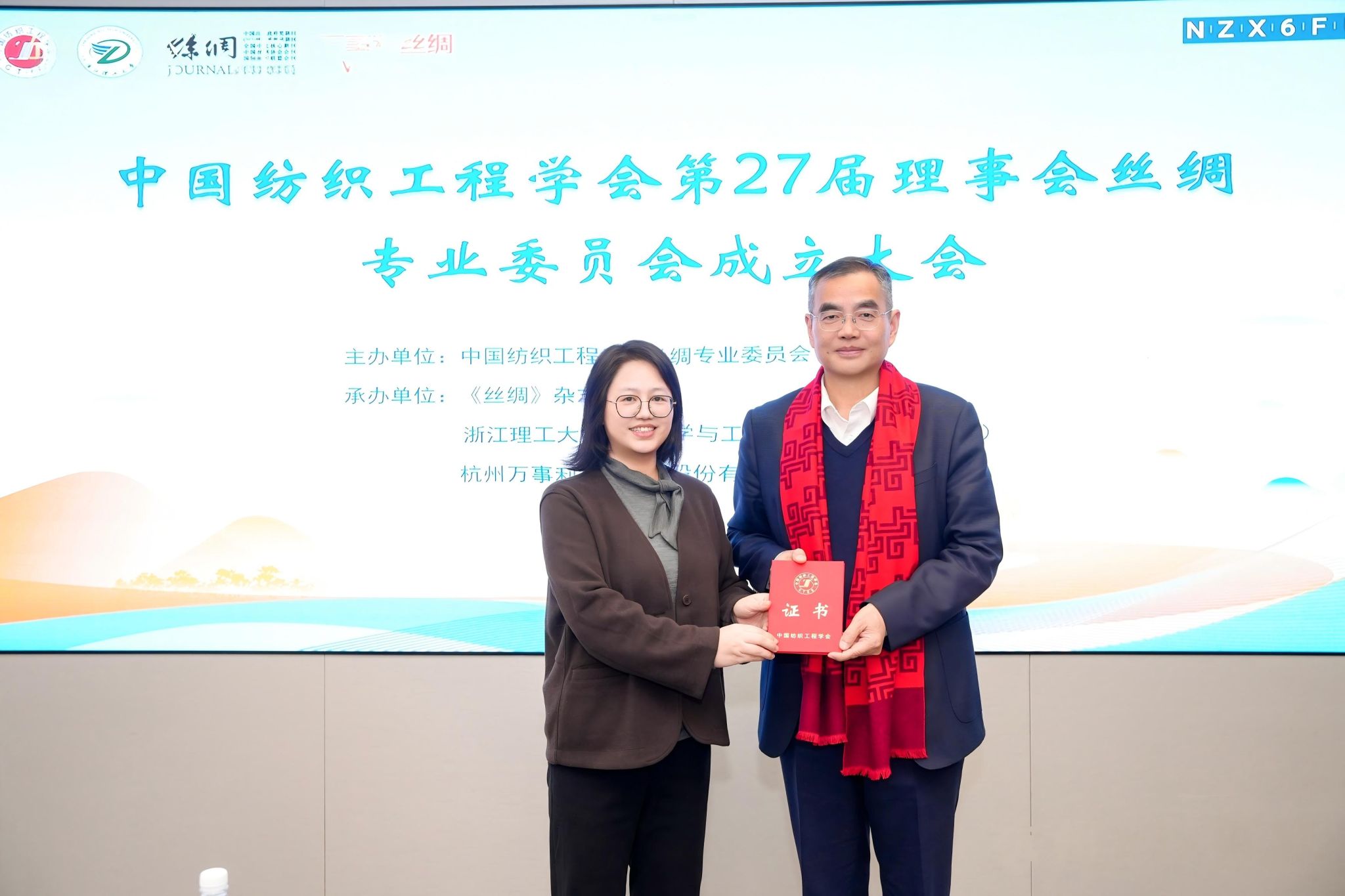 随后,中国纺织工程学会总工程师张洪玲代表学会向丝绸专业委员会主任姚菊明颁发聘书。随后,姚菊明主任为秘书长、副主任、委员、副秘书长颁发聘书。