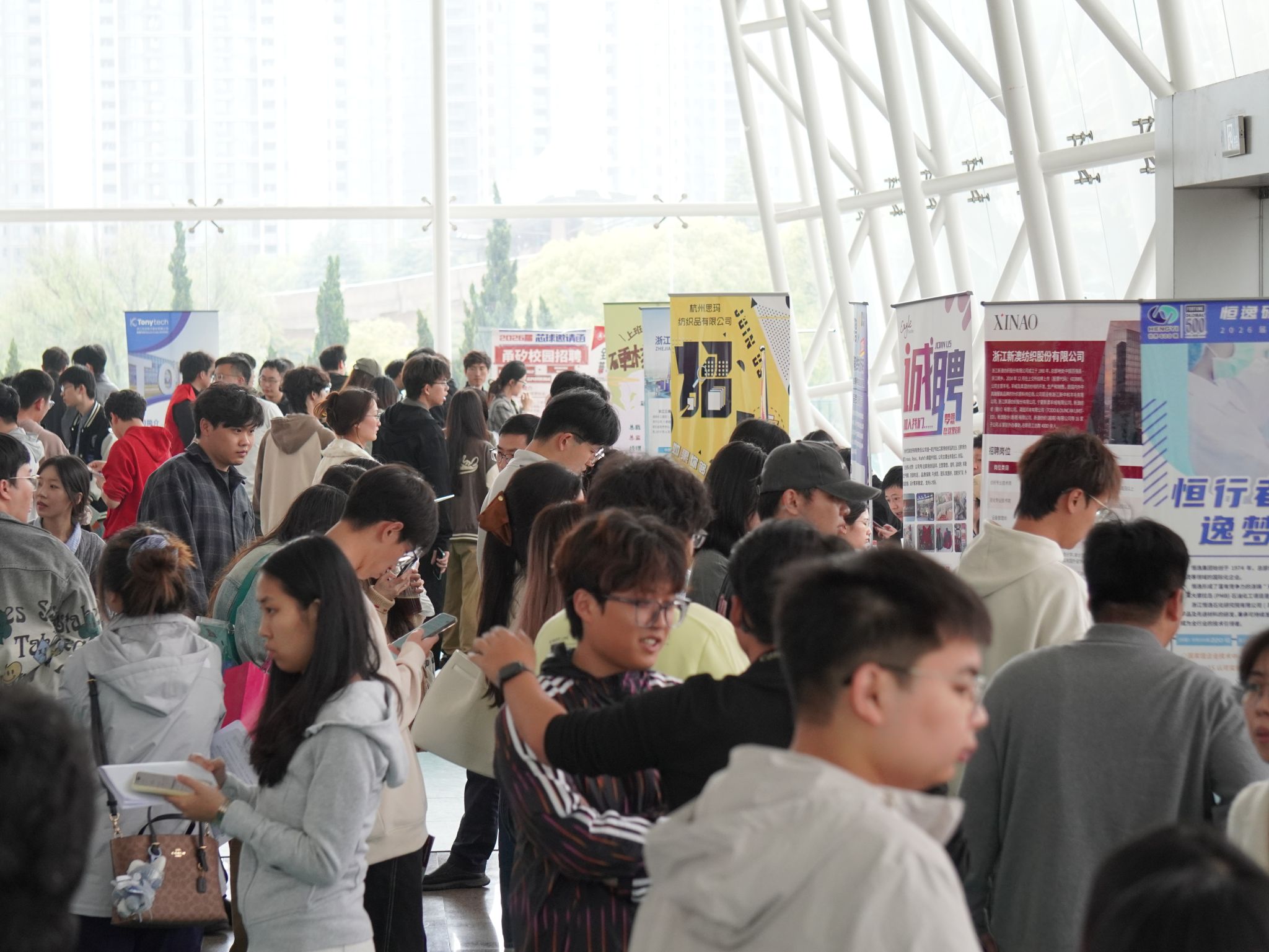 本次招聘会立足学科特色,精准对接纺织、材料、化工等产业链需求。现场共吸引100余家行业优质企业及校友企业参会,其中包括众多行业龙头企业及深耕细分领域的专精特新企业。招聘岗位涵盖纺织工程、材料科学、化学化工、智能制造、轻化工程等多个专业领域,累计提供就业岗位2000余个,为毕业生搭建了一个高效、精准的供需对接平台。