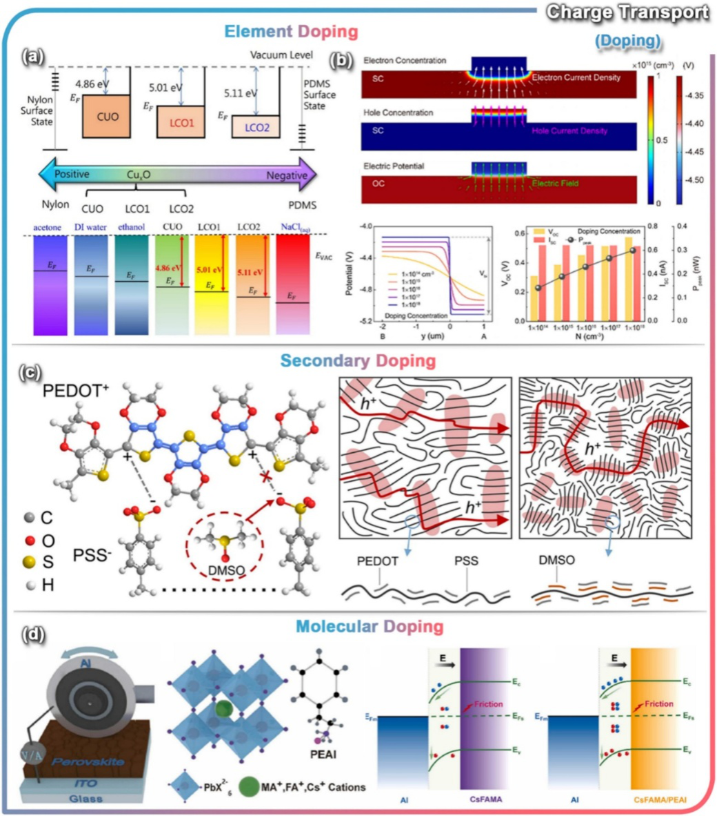 图4:掺杂策略以调控电荷传输。包括a-b)元素掺杂,c)二次掺杂,d)分子掺杂。